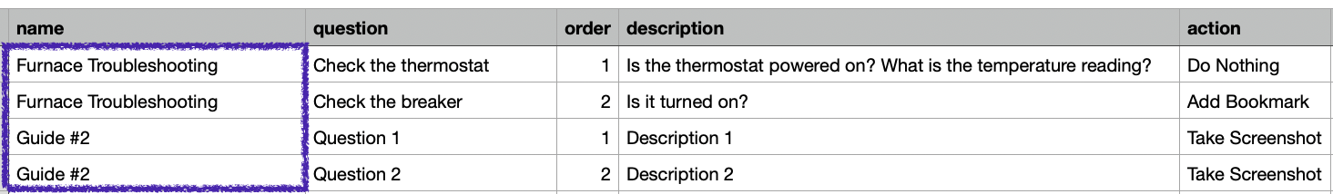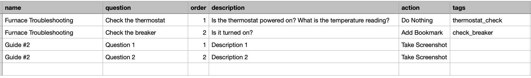 The Bulk Guide Import method lets you create one or more guides using a pre-formatted CSV spreadsheet. This method is ideal for longer guides or when drafting outside of the IrisCX UI.